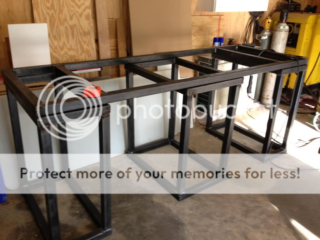 alt="">Finished Product. You will see the lack of the diagonal braces. After welding it all together it became clear we wouldn’t need them. The frame is solid. We do plan to connect the different parts together via 1/8” metal 90 degree straps but not until the tank is on the stand with water to allow for sagging. Shimming was a pain but that is life with a house built in 1955. By the way welding in the summer time sucks!!!!!
